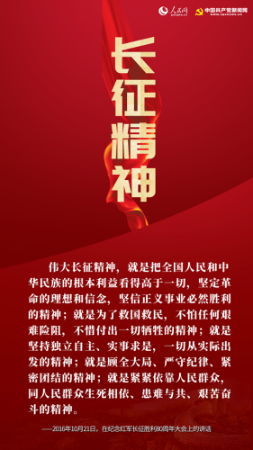 長(zhǎng)征精神,是中國(guó)共產(chǎn)黨人和人民軍隊(duì)革命風(fēng)范的生動(dòng)反映,是中華民族自強(qiáng)不息的民族品格的集中展示,是以愛(ài)國(guó)主義為核心的民族精神的最高體現(xiàn)。長(zhǎng)征精神為中國(guó)革命不斷從勝利走向勝利提供了強(qiáng)大精神動(dòng)力。繼承和發(fā)揚(yáng)長(zhǎng)征精神,對(duì)于建設(shè)有中國(guó)特色的社會(huì)主義,實(shí)現(xiàn)中華民族偉大復(fù)興的強(qiáng)國(guó)夢(mèng),具有重大意義。